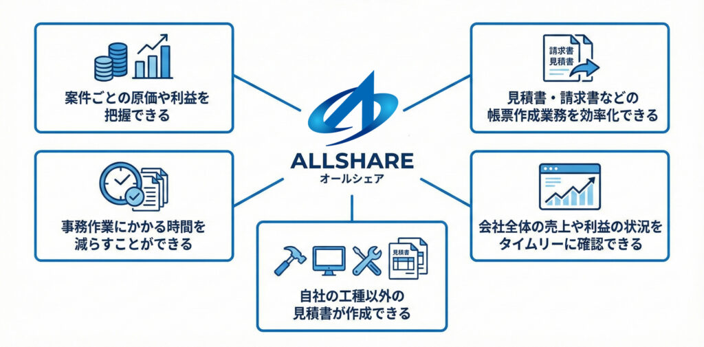 ALLSHARE(オールシェア)は、原価計算だけでなく、見積・請求・支払いまでをひとつの流れで管理します。「計算は合っているのに、なぜ利益が残らないのか」を後から確認できる点が特徴です。